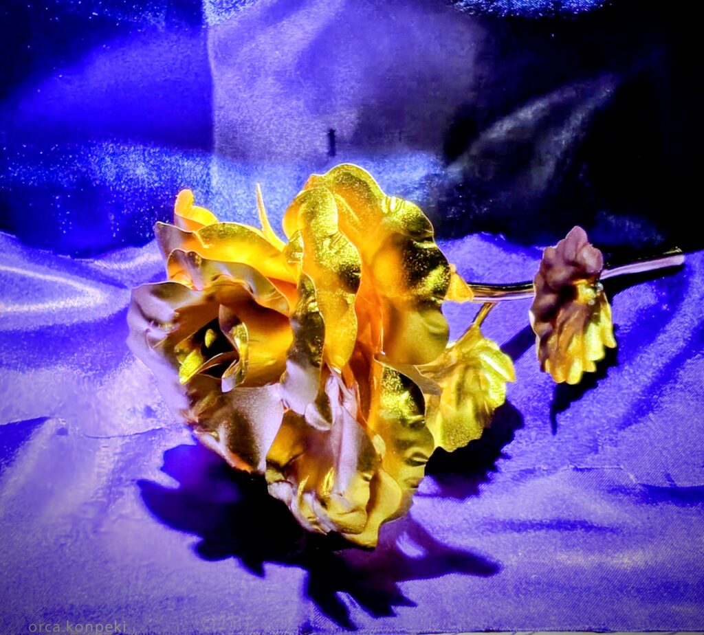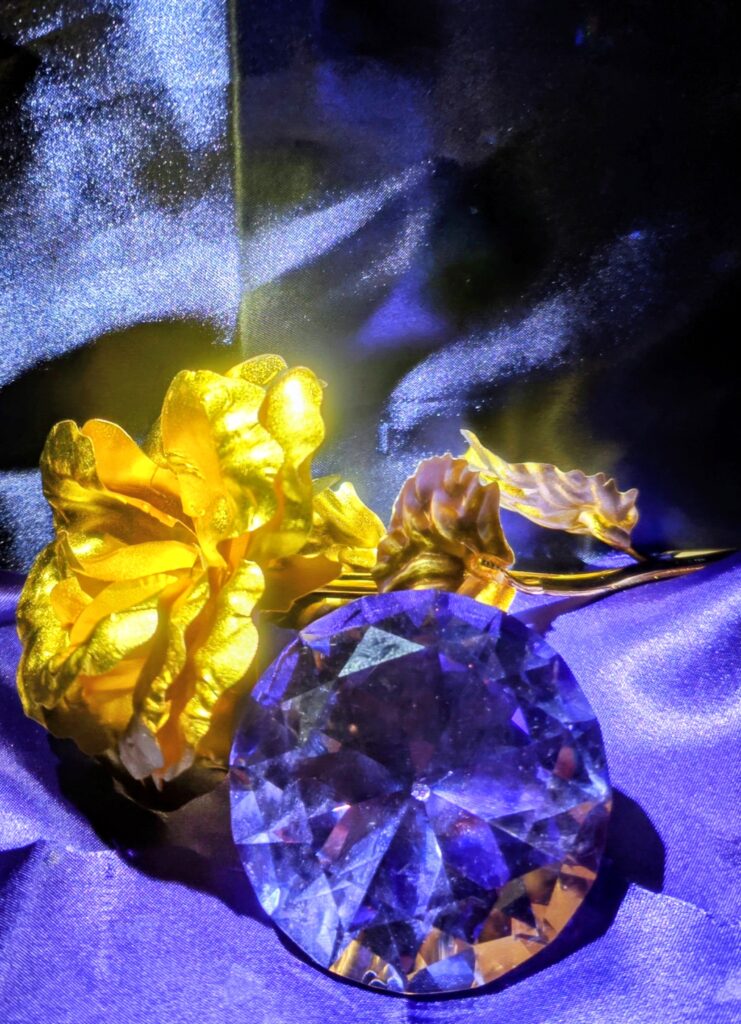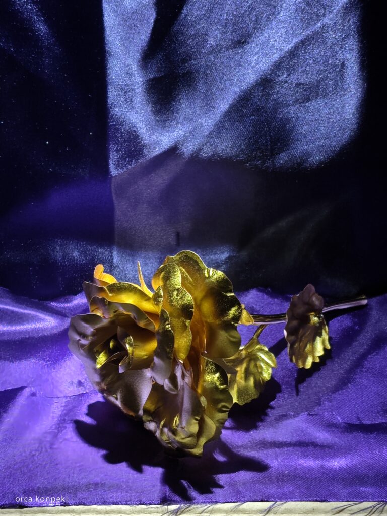 部屋の照明を暗くするか消す。または部屋の暗い場所で穴を開けたところに懐中電灯を灯してみましょう。画像のような私好みの空間ができました。この中に100均で買ったシックローズというアイテムの金色のバラを置いてみます。
