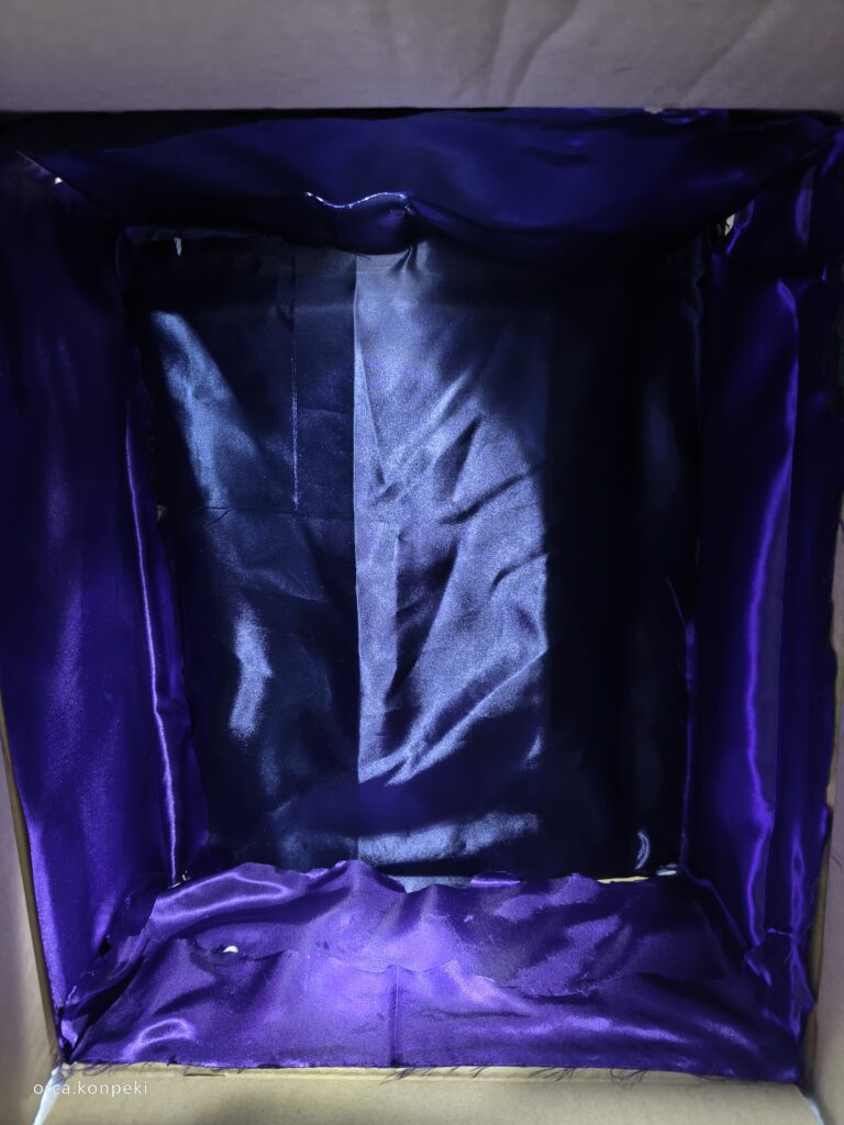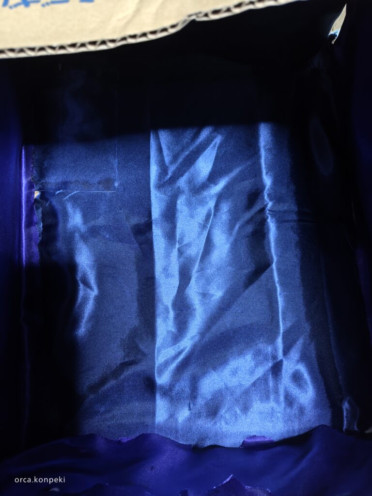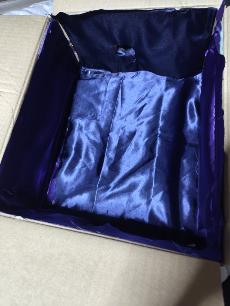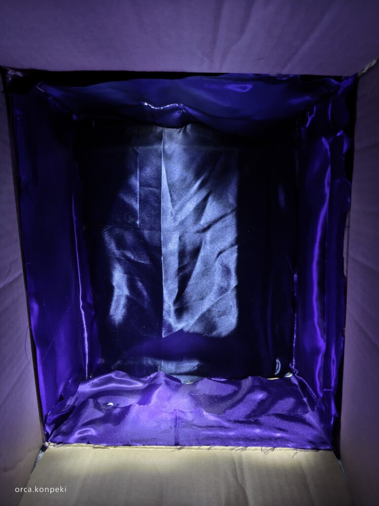 穴を開けたら、ダンボールに暗い色の布を貼り付けます。布を貼ってもいいですし、ダンボールを暗い色で絵の具やペンで塗ってもいいです。とにかく暗くしましょう。この魔法の箱の特徴は「光と影」を分かりやすくするためのものです。好みの雰囲気があったらその雰囲気にあった暗い色をおすすめします。私は海の中の深い青色や夜空の青みがかった黒が好きなので青~黒になるように作っています。