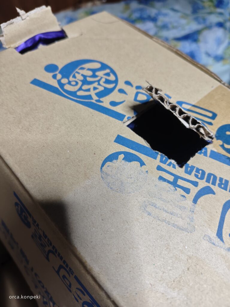 ダンボールを用意します。そのダンボールにあらかじめ光が差し込む場所を作ります。鉛筆などで丸を書いておきましょう。丸の大きさはダンボールのサイズにもよりますが、懐中電灯の灯りが差し込むくらいの大きさの丸を書き、カッターナイフで穴を開けます。私の場合は3か所開けました。