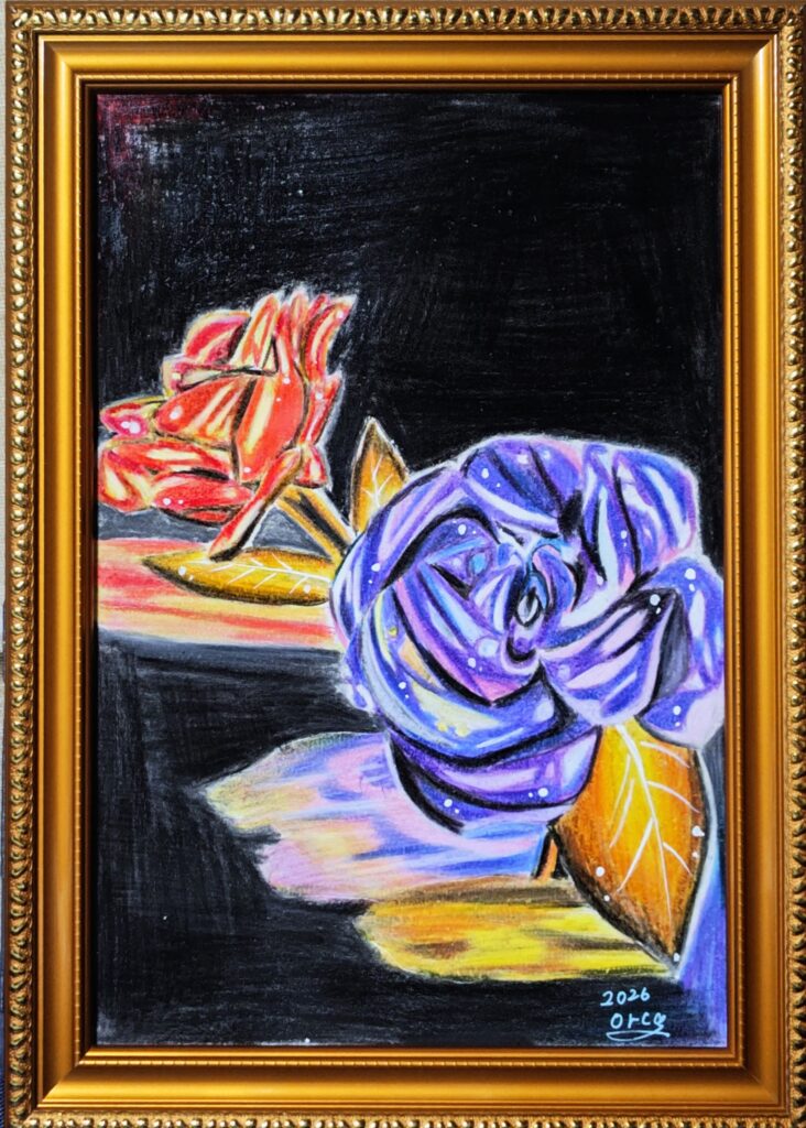 赤いバラの花言葉は「情熱」。紫のバラの花言葉は「誇り」。この2つの花言葉からバラを宝石に見立てて制作しました。葉の部分はべっ甲をイメージしています。