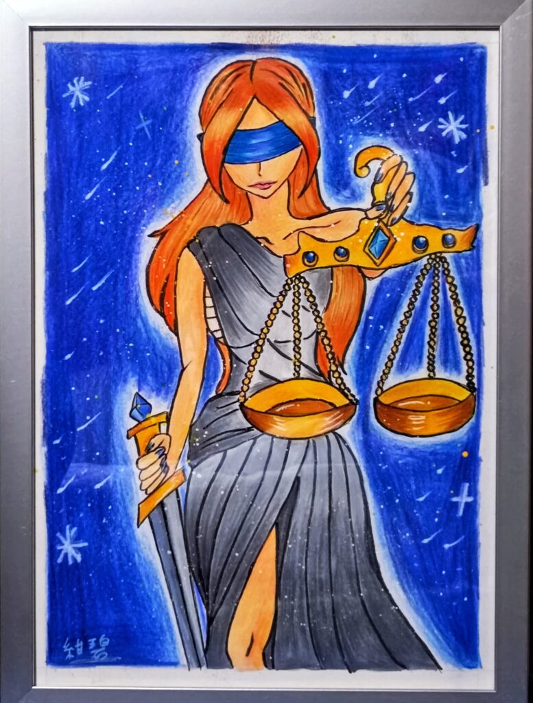 ギリシャ神話に出てくる正義の女神がいます。 この女神は主に銅像として裁判所にいます。 今日も女神の前で罪人は裁かれます。 女神の前で様々な人が証言します。 女神はどんな気持ちで証言を聞き、裁きを見届ける のでしょうか?目隠しされている目はどのように見 えるのでしょうか?そんな疑問を胸に制作しました。